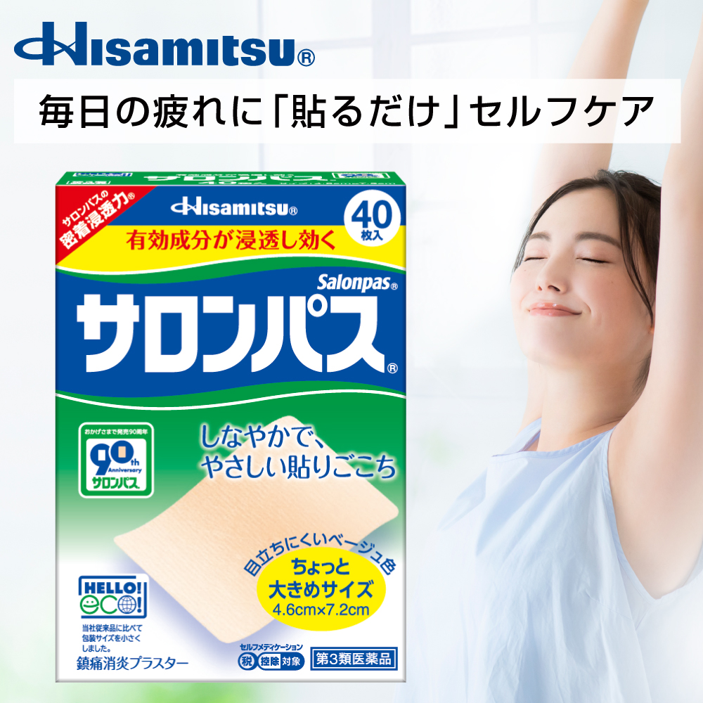 | ●サリチル酸メチル10%配合。サロンパス?史上最高濃度(サロンパス?Ae比 約1.6倍。) 有効成分が深く浸透、効果感がしっかりアップしました! ●しなやかで、やさしい貼りごこち。肌にぴったりフィットし、つっぱりません。 ●ちょっと大きめ、サイズ約1.2倍※。( 4.6cm×7.2cm)コリや痛みの部位を広く覆えます。 ●目立ちにくいベージュ色採用。薄手の服でも目立ちません。 ●はがれにくい「丸かど 」採用。衣類などでこすれても、はがれにくくなりました。 ※サロンパス?Ae比 |