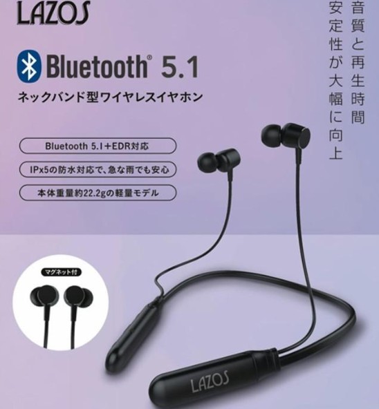 【ポスト投函で送料無料】LAZOS 運動時も安心の安定感 防水対応 ネックバンド型ワイヤレスイヤホン Bluetooth5.1 L-BTE-BK