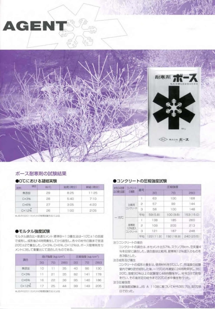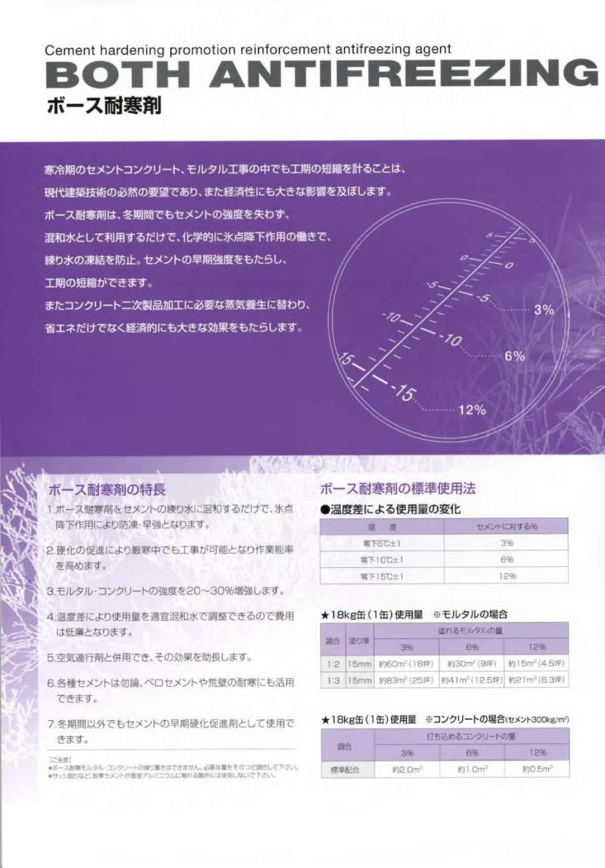 1.ボース耐寒剤をセメントの練り水に混和するだけで、氷点降下作用により防凍・早強となります。