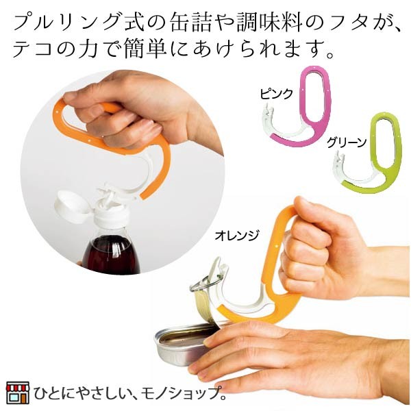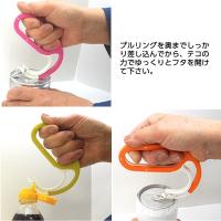 | 商品特長 | ・プルリング式の缶詰や調味料のフタが、テコの力で簡単にあけられます。 ・金属を使っていないので、洗いやすく安心です。 ・持ち手部分はエラストマーを採用しているので滑りません。 ・プルリングに先端部分を引っかけて、持ち手を手前に引くだけで簡単に蓋を開けることができます。 ・先端部分がアリ溝形状なので、空いたフタが飛ぶ事がありません。 |