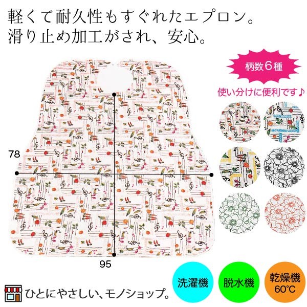 | 商品特長 | 軽くて耐久性もすぐれたエプロン。滑り止め加工がされ、安心。 ・巾広サイズで洗濯してもとれない耐熱防水加工。 ・食事の時に裏生地が滑らないようにスベリ止めつき。 |