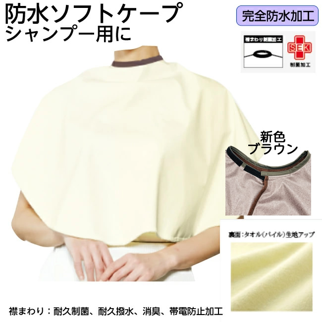 | 商品特長 | 表は完全防水、内側は肌に優しいパイル素材を使ったシャンプーケープです。 手術後のシャンプーやシャワーで活躍。 裏面は肌触りのよいパイル地なので、つけたときにもひんやりしません。 首回りは面テープ(マジックテープ)で着脱。 表地:完全防水加工。 シャンプー用に。 襟まわり:耐久制菌、耐久撥水、消臭、帯電防止加工 |