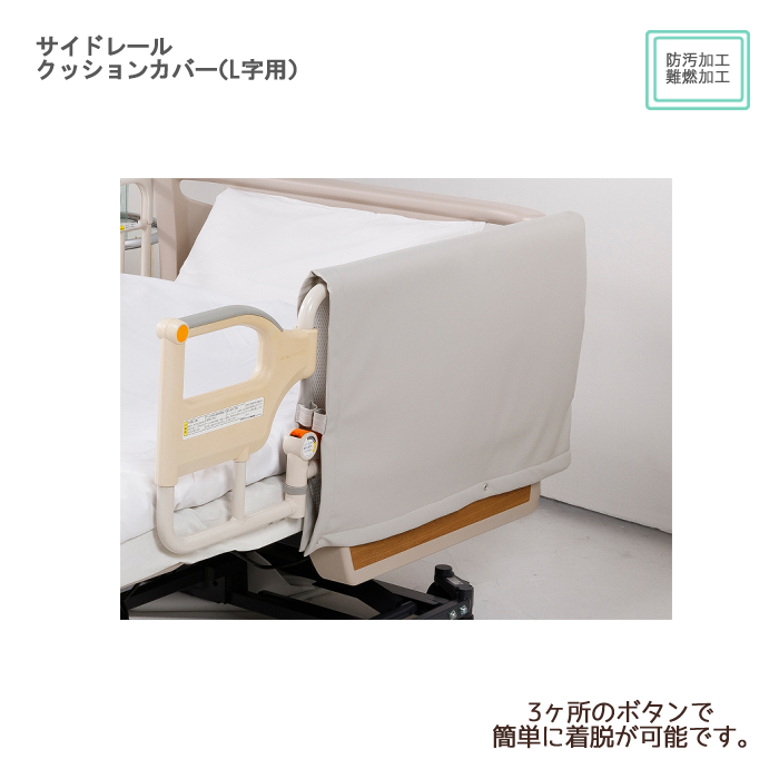 ●ベッドサイドレールから腕や脚がはみ出るのを防ぐ緩衝材入りカバー。L字柵の固定部に取り付けられます。