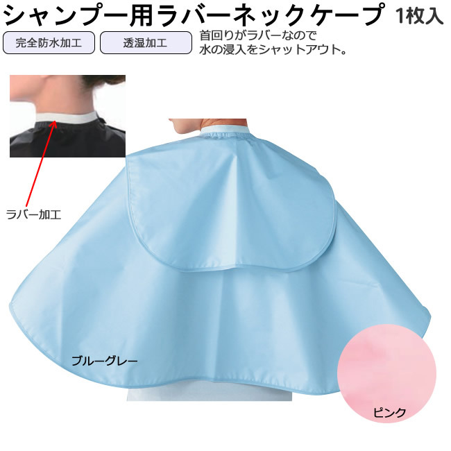 | 商品特長 | ホワイトラバーゴムが首回りに優しくフィットし、シャンプー時の水の浸入をシャットアウト! 首回りは面テープ(マジックテープ)で着脱。 完全防水・透湿加工。 パーマ、ヘアダイ(黒のみ)、シャンプーに。 |