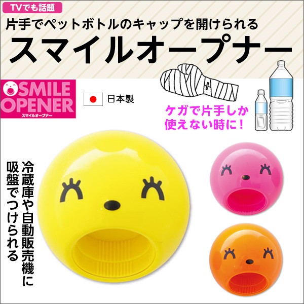 | 商品特長 | ケガなどで片手しか使えない時のちょっとした不便を解決! ペットボトルのフタを片手や、小さな力で簡単に開けることができる補助器具です。ペットボトルのキャップ部分は口径が小さいため握りにくく、開けることができない場合がありますよね!そんな時はスマイルオープナーを使って開けてください♪ お子様からお年寄りまで皆さんに使っていただける便利雑貨です! ネイルをされている女性などにもおすすめですよー! 手に力が入りにくい方に、 手が滑ってペットボトルのキャップが開けにくい、などちょっとした不便を感じている方への プチギフトとしても♪ |