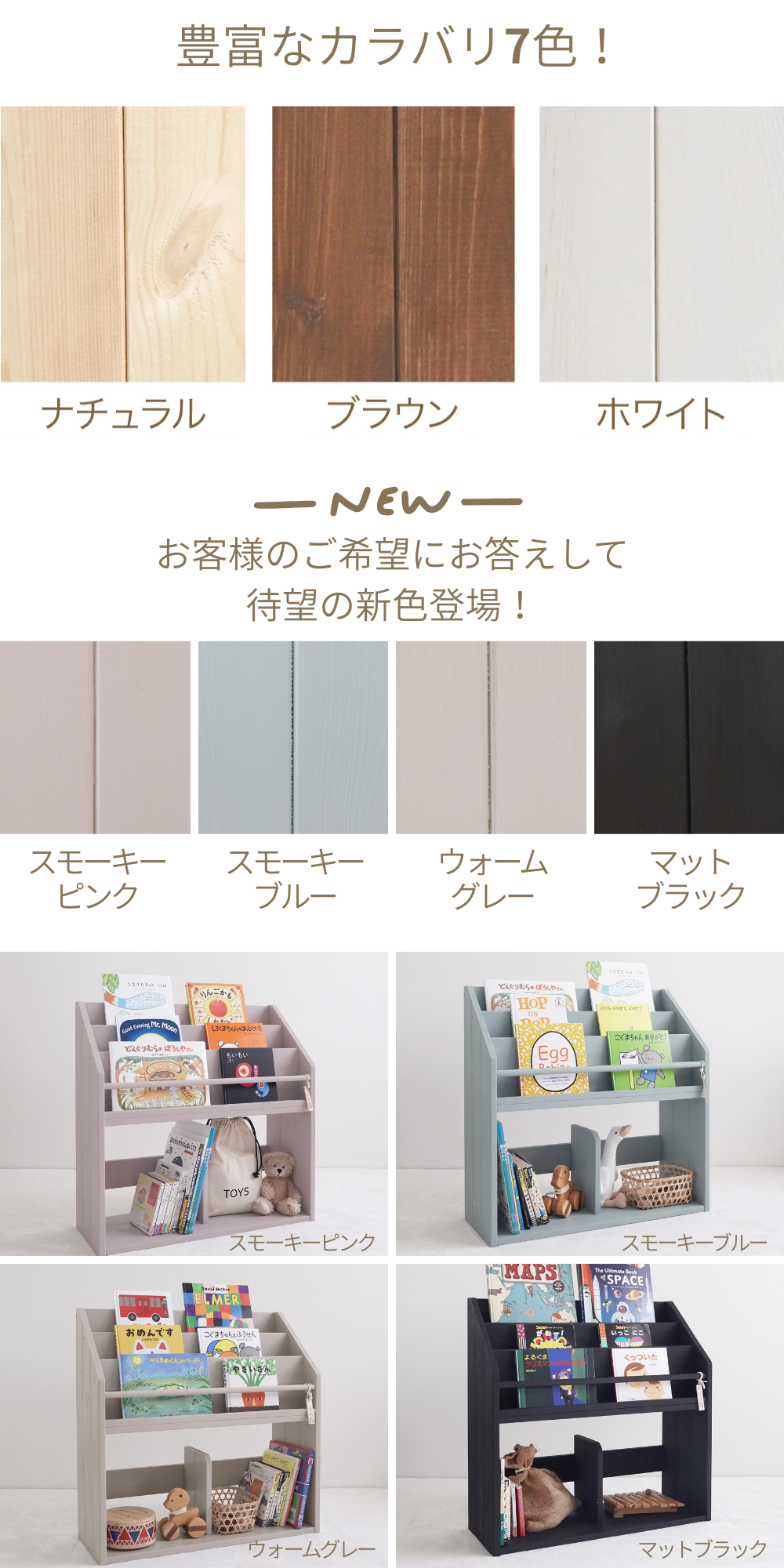 | 商品名 | 表紙が見える絵本棚 Lサイズ(ナチュラル・ブラウン・ホワイト・スモーキーピンク・スモーキーブルー・ウォームグレー・マットブラック) |