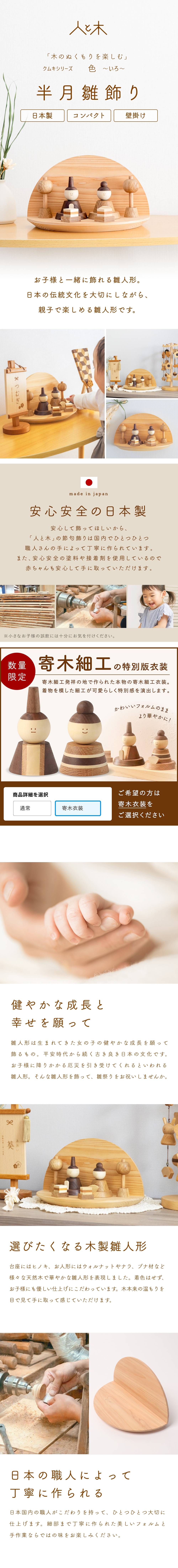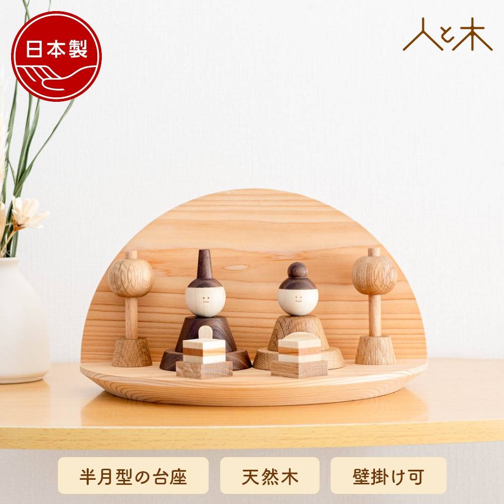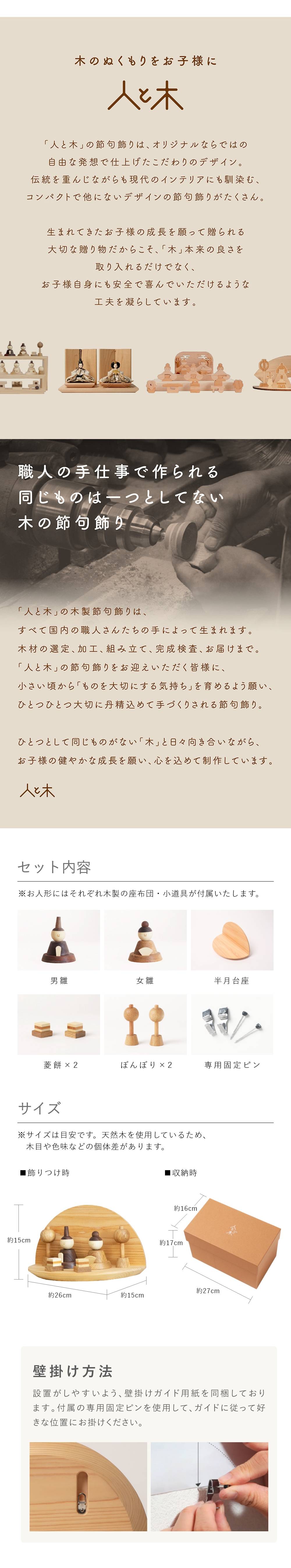 | 女の子の健やかな成長を祈って 壁掛けなど好きな飾り方で飾れる木製の雛人形 「色 ~いろ~ 半月雛飾り」 木製の部分は着色はせず、自然の木の色をいかした節句飾りです。ウォルナット、ナラ、ミズキ、ひのきなど、種類が異なる天然木を使用しております。木の温もりを感じていただけるよう、職人さんが1つ1つ丁寧に作っております。 コンパクトに飾れる大きさ 広いスペースが取れないなど今どき住宅事情を踏まえ、コンパクトに飾っていただきたい。お雛様とお内裏様のみの親王飾りでしたら、比較的コンパクトに飾っていただくことが出来ます。設置サイズ:幅約26cm 奥行約15cm 高さ約15cm 壁掛けについて 商品と一緒に、壁掛けする際に必要な石膏ボード用のピンとフックを同梱しております。(耐荷重2kg)専用の用紙もつけておりますので、そちらをお使いいただけましたら、簡単に壁に飾り台をかけることが出来ます。ひな祭りが終わっても、お部屋のインテリアとして、お使いいただくこともできます。 |