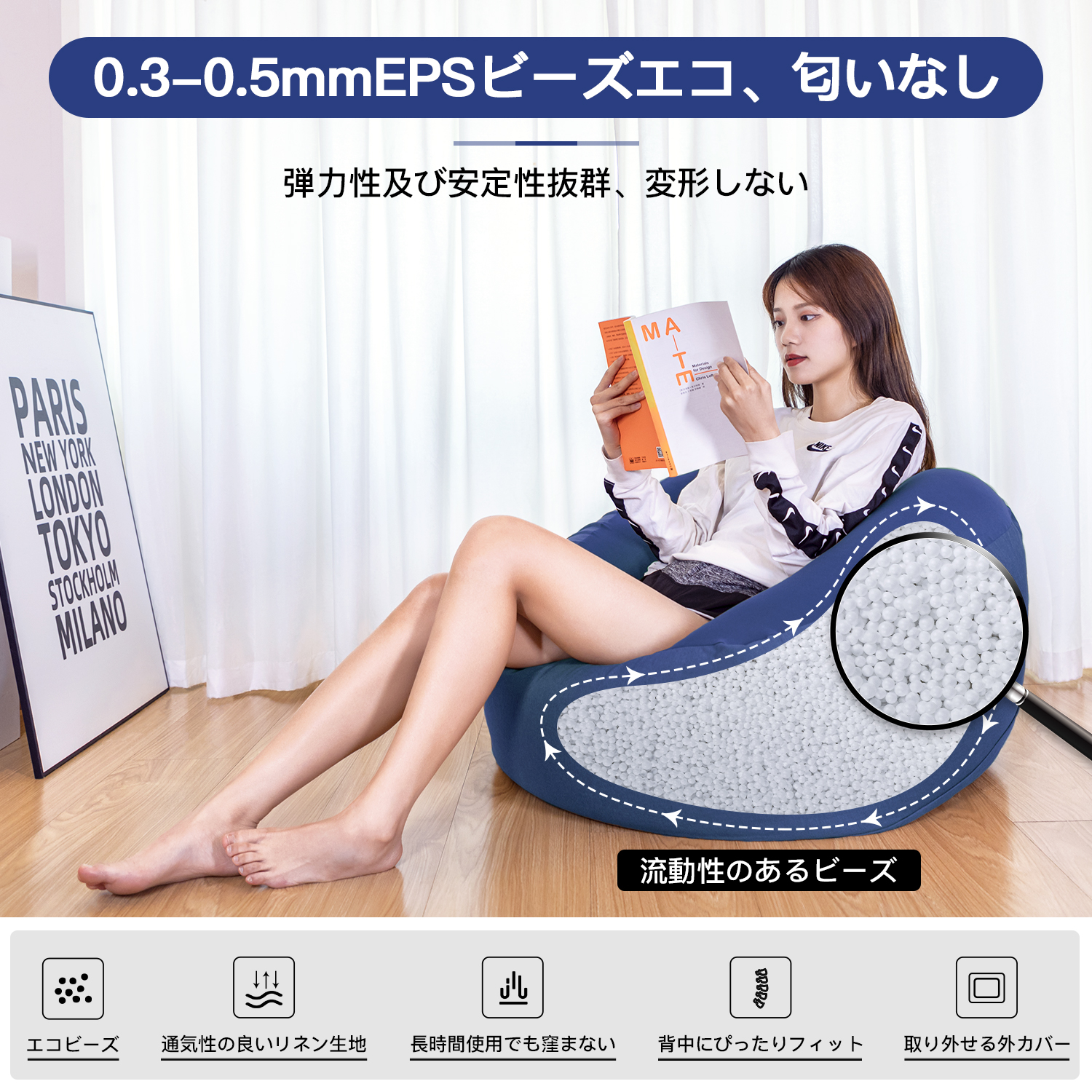 【自由にスタイルを作り、ゆったりと寛ぎます】:ビーズクッションはエコで健康的な直径0.3-0.5mmのEPSビーズで充填されています。極小のビーズは流動性と弾力性があります。座ると背中をしっかりと支え、体にピッタリフィットします。