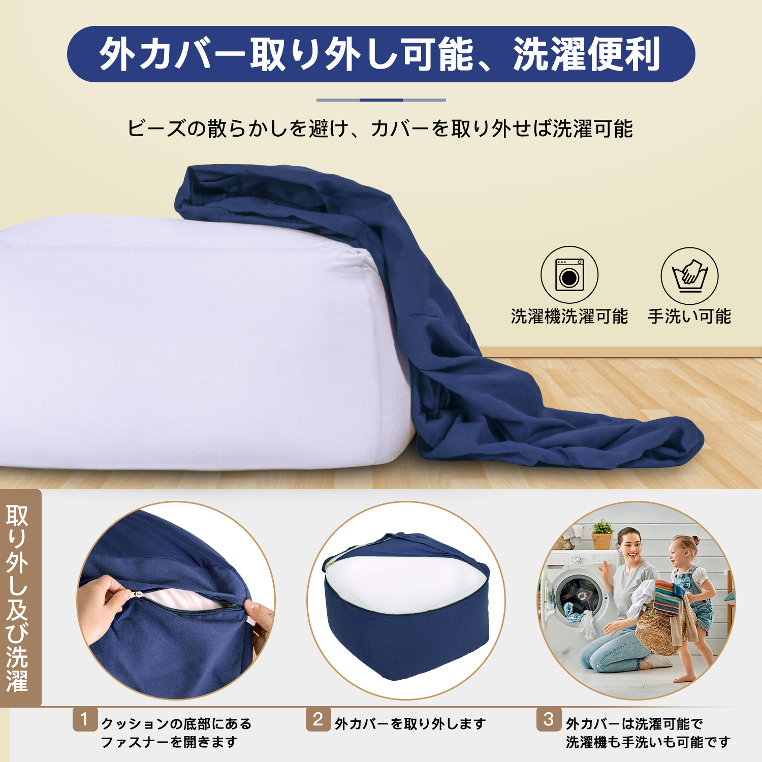 【心遣いのあるデザイン、取り外し可能な外カバー】:隠しファスナーは金属ジッパーが床を傷つけることが防止できます。中袋にはビーズ量の調整や補充できる二重のファスナーがついています。EPSビーズの漏れを防ぐだけでなく、EPSビーズを追加するための便利さも提供します。 外カバーが取り外しやすく、お手入れも簡単です。手洗い、洗濯機洗い可能で、高品質の生地は色あせしません。