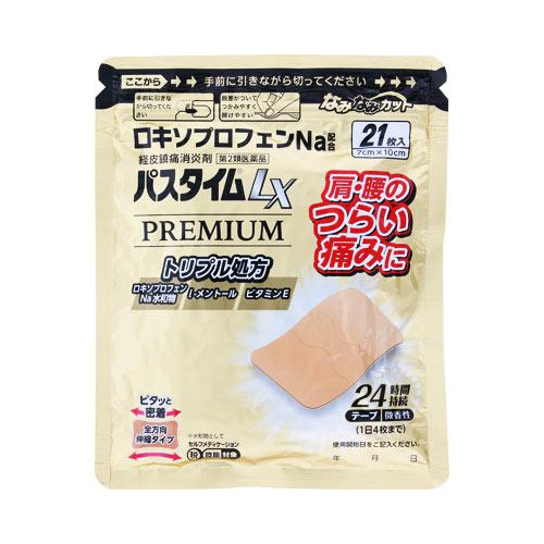 パスタイムLXプレミアムは、すぐれた鎮痛消炎効果をもつロキソプロフェンナトリウム水和物を配合し,つらい痛みに24時間効き続けます。?-メントールを配合し,心地よい冷感刺激で痛みを緩和します。サイズ 7cm×10cm