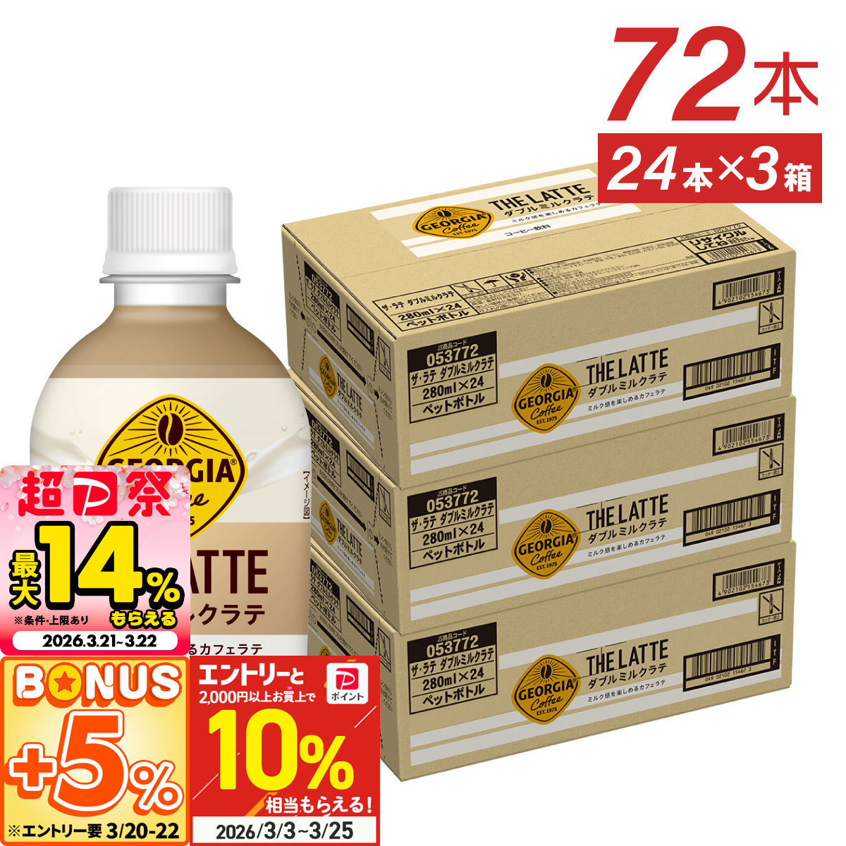 コーヒー ペットボトル ラテ ジョージア ザ ラテ ダブルミルクラテ280ml 24本入 3箱 72本 送料無料