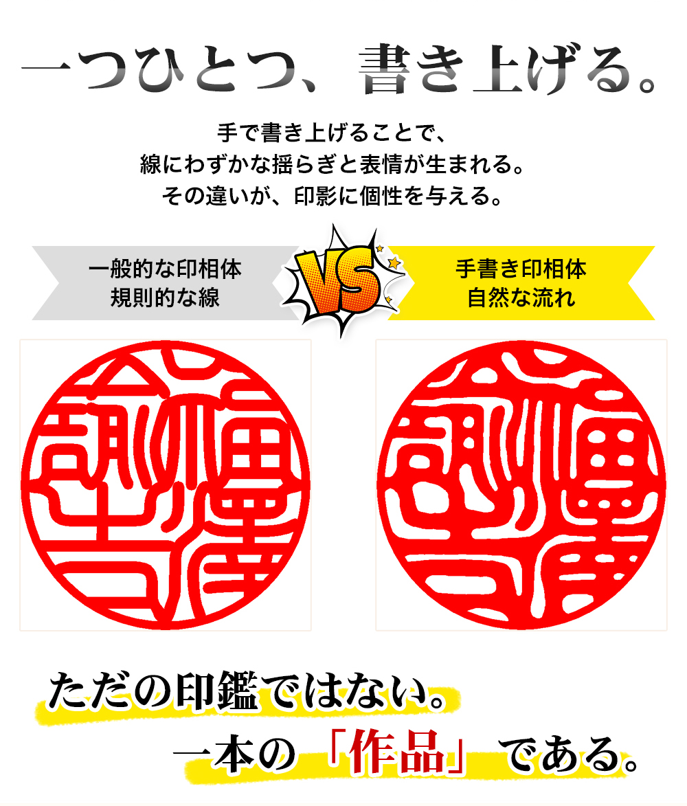 手書き印相体デザインは、世界に一つだけの印鑑として、実印・銀行印・認印など幅広い用途でご使用いただけます。デザイン修正は2回まで無料、3回目以降は1回200円となります。なお、デザイン作成後のキャンセルは設計費500円を頂戴いたします。