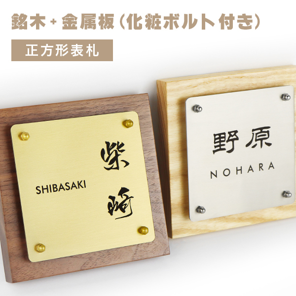 木製表札 金属表札 戸建 組合表札 ウォールナット 超おしゃれ 表札 マンション おしゃれ 玄関 アパート 銘木5種 正方形表札【銘木+金属板表札(化粧ボルト付き)
