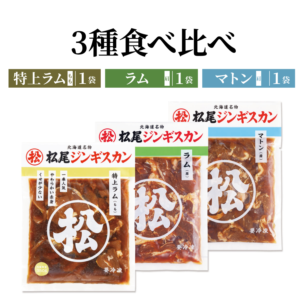 松尾ジンギスカン 3種食べ比べセット 特上ラム 味付ラム 味付マトン 350g×各1袋 北海道 焼肉 ラム肉 味付き 有名店 加熱料理用 爆買