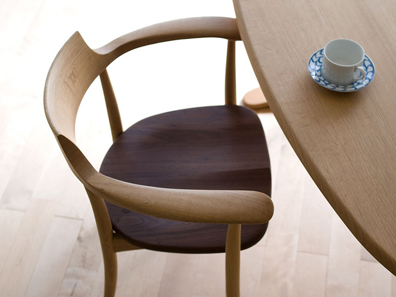 この背板から木肘までを一体化することにより座り心地を良くすると同時に無駄のない美しい曲線を描いています。