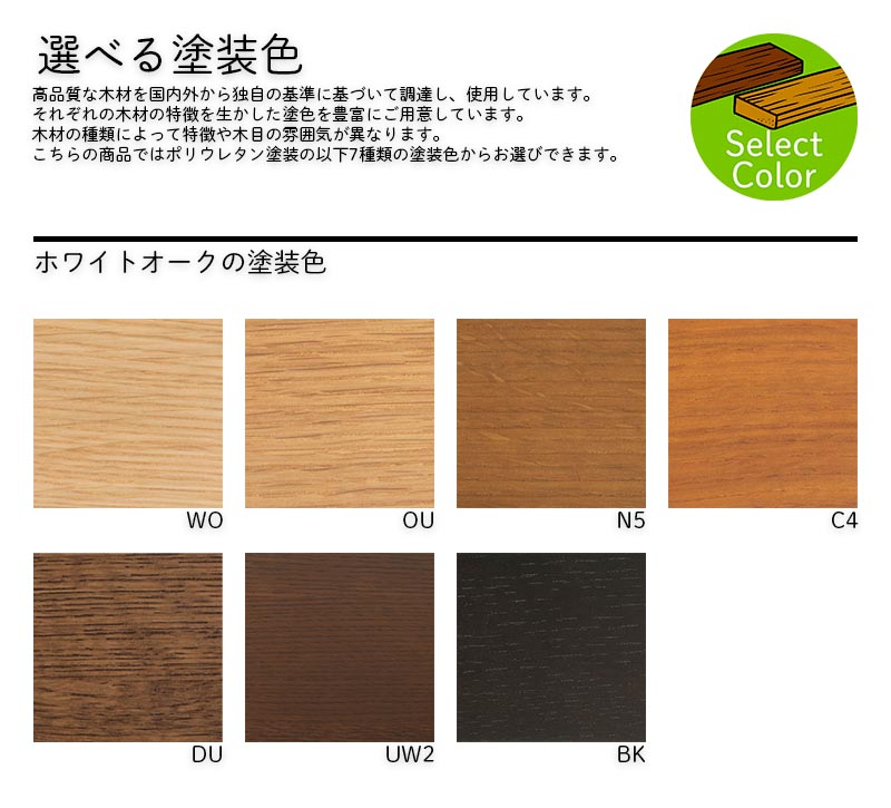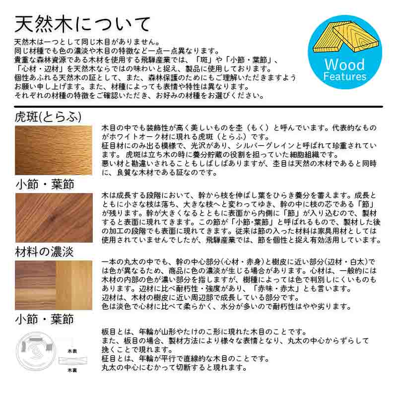 | | 仕様 | 材質:ホワイトオーク材 塗装:ポリウレタン樹脂塗装 生産:日本、飛騨高山