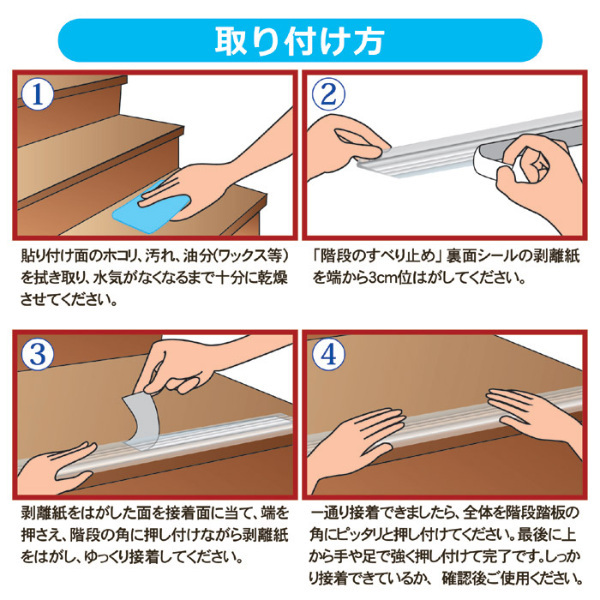 滑り止め機能はそのままに、透明タイプに仕上げた階段専用滑り止めなので、違和感無く設置いただけます。階段の角に合わせて貼るだけ、とても簡単。上面には3本の溝をデザインしてますので滑りにくくなっています。単に「透明タイプ」ということだけでなく、安全第一の商品であるからこそ、メーカーは品質にこだわり、一つ一つ丁寧に作られているそうです。透明タイプの両面テープを使用していますので階段になじみ、貼っても目立ちません。