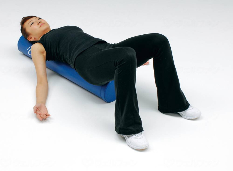 床に置いたローラーの上に仰向けに寝るだけ。無理な姿勢をとらず、リラックスして自分の体重を活かし背中をポールに当てるだけ。