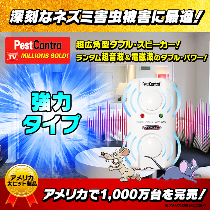 ※【強力タイプ】は、上下2つの超広角ダブル・スピーカーから25,000〜100,000ヘルツの超音波が波を打ったように波長を上下に大きくアトランダムに【全自動】で変動させて発信され、また電磁波が(目に見えない)壁の中の屋内電気配線コードをずーーと伝わり天井裏/屋根裏にまで到達するので、ネズミ害虫の駆除効果バツグン!