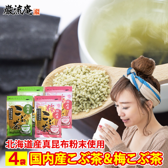 北海道道南産真昆布の粉末を使用した国内産こぶ茶と梅こぶ茶。お湯と混ぜてこぶ茶としてお召し上がりいただくのはもちろん、調味料やかくし味としてお料理にもお使いいただけます。