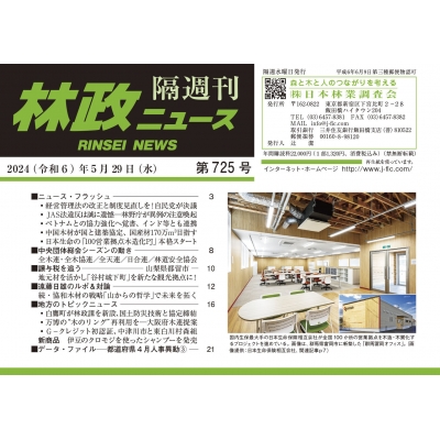 内容詳細:第725号は、森林経営管理法の改正と制度見直しへ自民党が決議/JAS法違反は誠に遺憾、林野庁が異例の注意喚起/全木協連会長に平方宏氏、全天連会長に山下光明氏/譲与税を追う・山梨県都留市/続・協和木材の戦略「山からの哲学」で未来を拓く/白鷹町が国土防災技術と包括連携協定締結/伊豆産クロモジを使いシャンプー&コンディショナー――などを掲載しています。