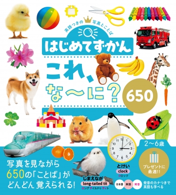 内容詳細:言葉をおぼえはじめる乳幼児にむけた、ものの名前をおぼえるための写真図鑑。さまざまなジャンルごとに、写真と単語を英語付きで掲載しています。「どうぶつ」、「むし」、「はな・しょくぶつ」、「やさい」、「くだもの」、「のりもの」といった、子どもたちが興味を持つ基本的な言葉から、「ひらがな」、「アルファベット」、「あいさつ」、「いろ・かず・かたち」など、この先の学習に役立つ言葉も加え、合計650種類を収録。