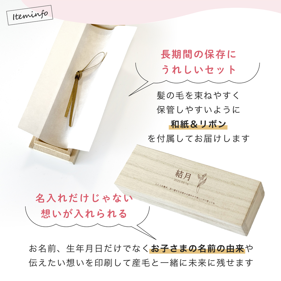 赤ちゃんの小さな宝物、産毛をやさしく守る。大切な思い出を、ずっときれいに保存できる桐製の産毛専用ケース。
