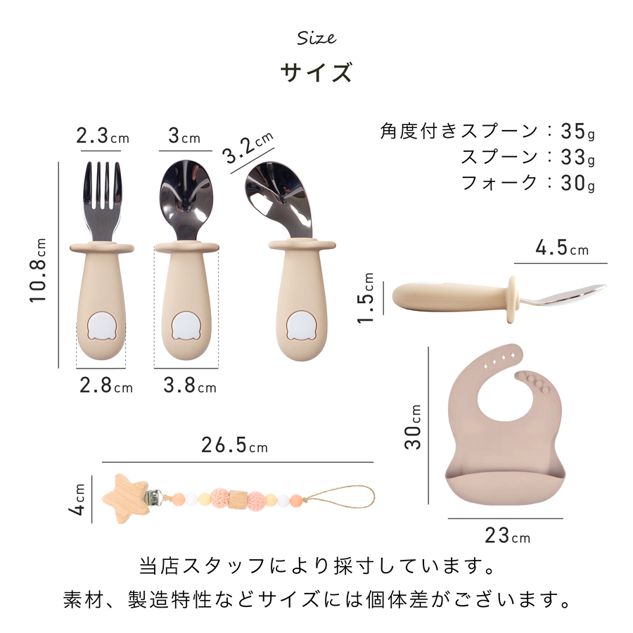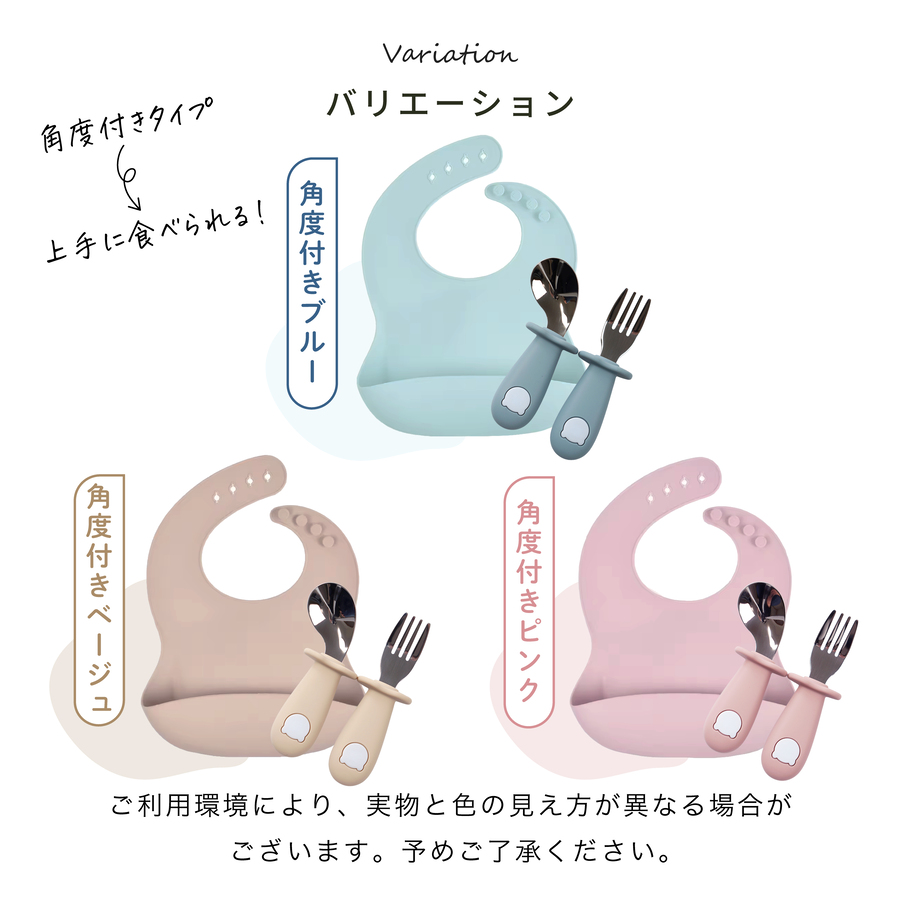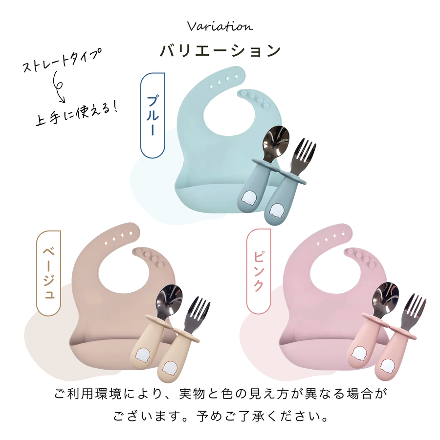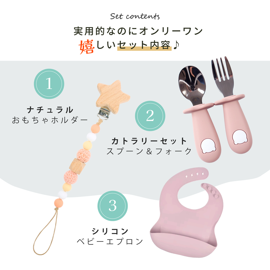 【商品内容】おもちゃホルダー×1カトラリーセット×1(スプーン×1、フォーク×1)シリコンエプロン×1