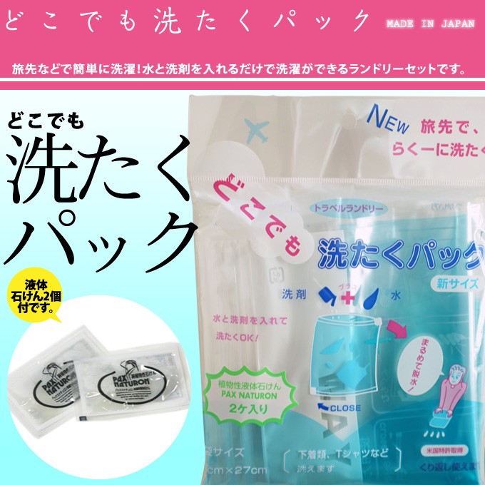 | 特徴 | 「どこでも洗タクぱっく」は、水と洗剤を入れるだけで洗濯ができるランドリーセットです。旅先などで簡単に洗濯できるので、荷物を減らしたいときに役立ちます。下着類、Tシャツなどが洗えます。繰り返し使用可。植物性液体石鹸2個入り。 |