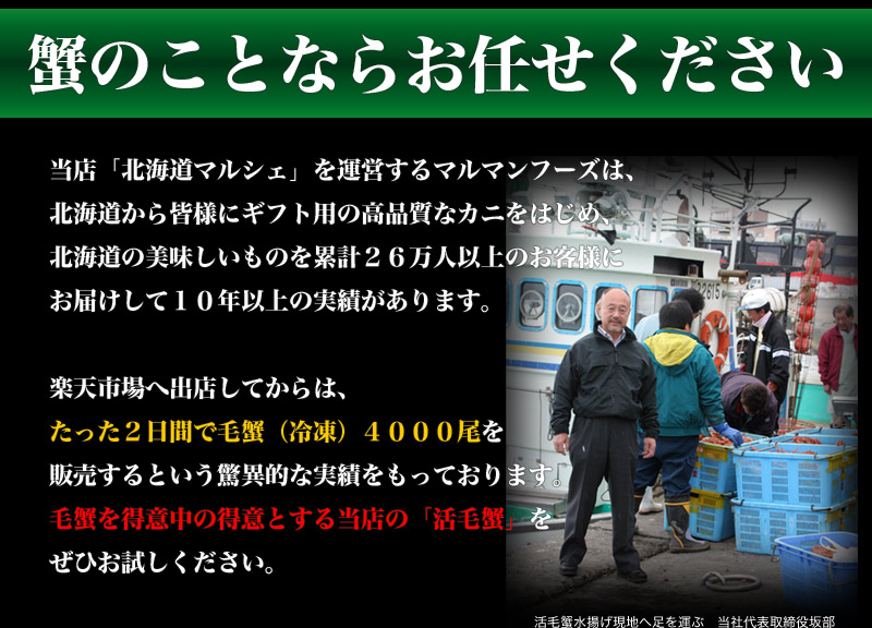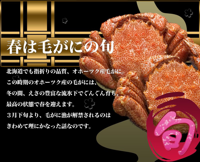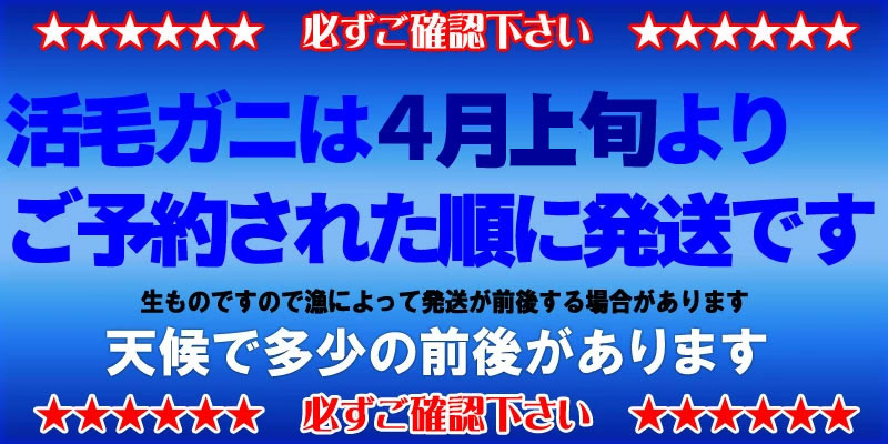 毛蟹は自然のもののため個体差がございます。複数ご購入の場合は合計重量でお届けいたしますが、サイズに多少の違いが出ることがございます。表示重量に満たない個体が含まれる場合もございますが、数量分はしっかりお入れしておりますのでご安心ください。