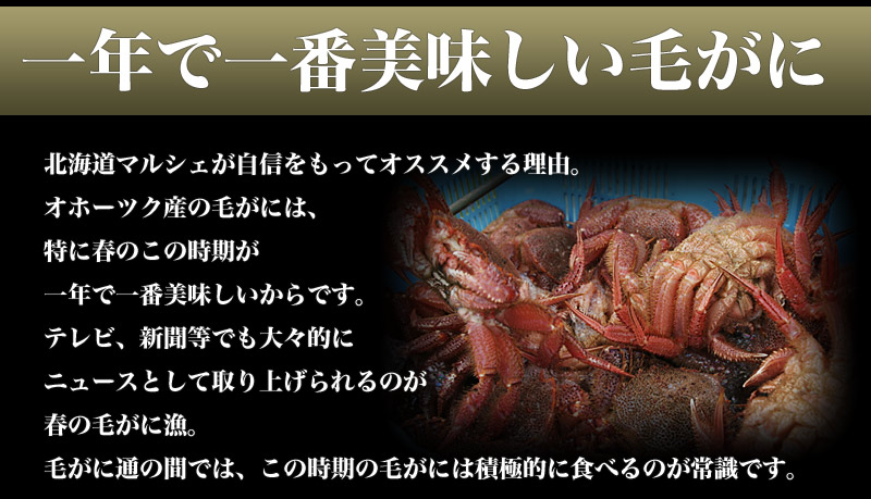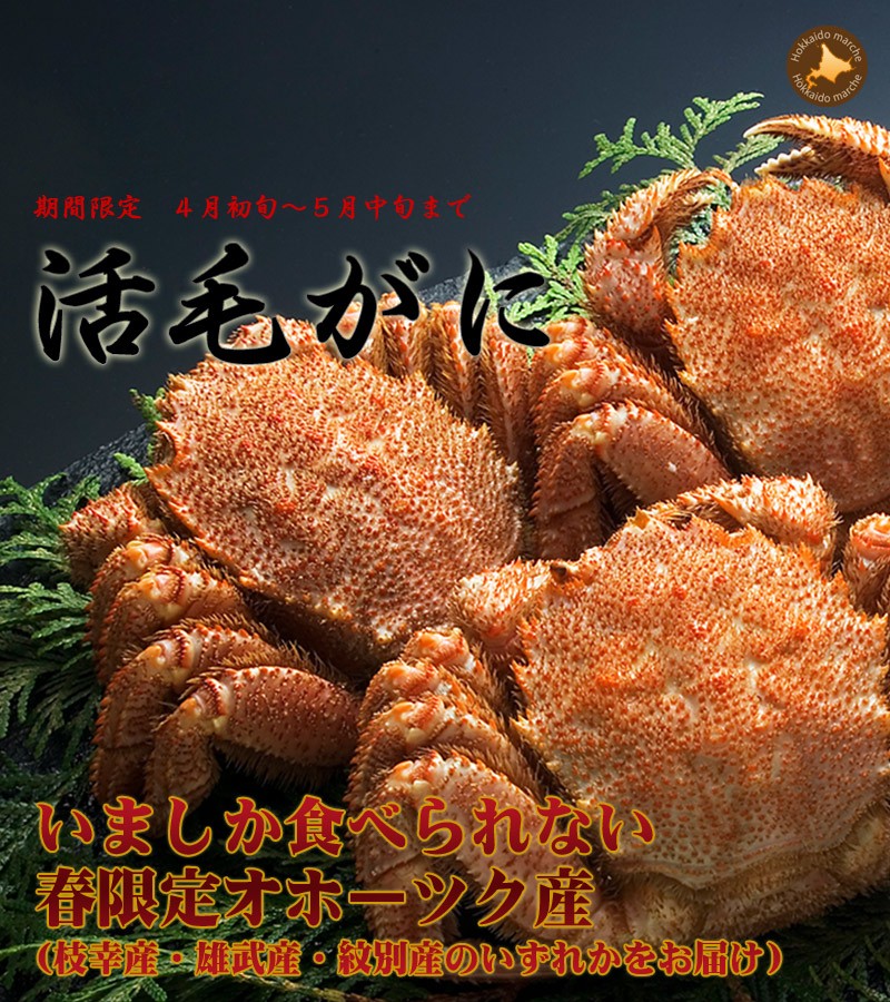 活毛ガニを食べるなら、春に水揚げされるオホーツク海産毛ガニです。北海道のどこででも毛ガニはとれますが、オホーツク海に面した枝幸、雄武、紋別はとくに毛ガニの名産地として知られています。活毛ガニがおいしいのは、育った環境にもよります。自然豊かなアムール河より豊富な栄養素がオホーツク海に流れ、プランクトンが育ちます。このプランクトンが流氷にのってやってくるので、この時期のオホーツクの海は特別に餌が豊富です。当店では春の毛ガニ漁が始まる前よりご予約を承ります。カニ通が好む身がふわっとして風味が豊かな活毛ガニはこの時期だけの贅沢なグルメ。