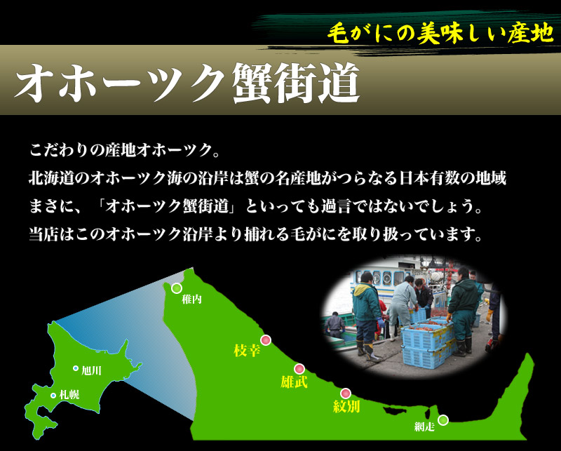 毛がには北海道のどこの海岸でも水揚げされますが、やはり名高い産地といえば、雄武・枝幸・紋別などのオホーツク沿岸。