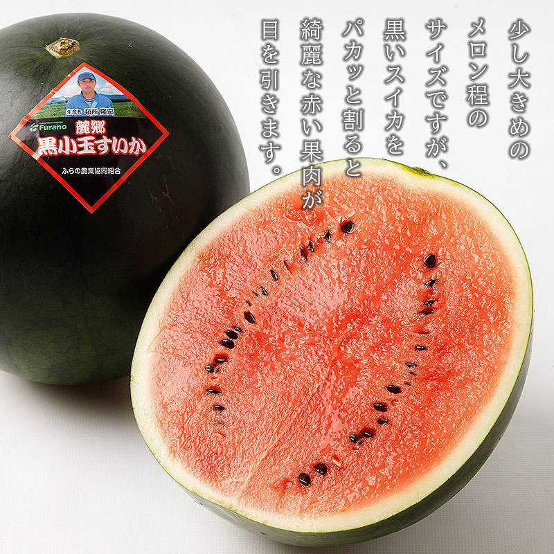 | 商品説明 | 「北の国から」で有名な、富良野麓郷で栽培された、珍しい黒皮の小玉スイカです。 少し大きめのメロン程のサイズですが、黒いスイカをパカッと割ると綺麗な赤い果肉が目を引きます。 甘くてみずみずしく、シャリシャリとした食感で、夏の涼を感じることが出来ます。 割らずに冷蔵庫に入れられるのもオススメのポイントです。 お中元、内祝、快気祝、誕生日、プレゼントなどにオススメ。 | ||