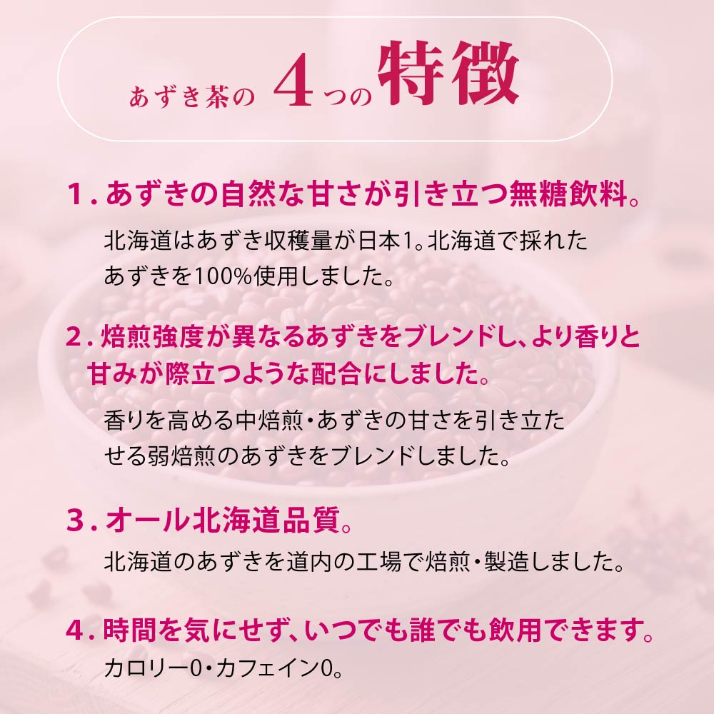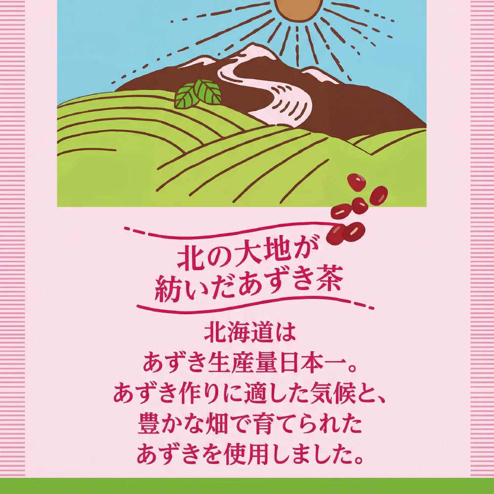北海道産あずきを100%使用した、やさしい甘みと香ばしい香りが特長の無糖茶飲料です。道内工場で焙煎した強さの異なるあずきをブレンドし、素材の風味を活かした飲みやすい味わいに仕上げました。カフェインゼロ・カロリーゼロで、食事中や休憩時間など、時間を気にせず楽しめます。北海道の大地が育てたあずきの魅力を感じられる一杯です。
