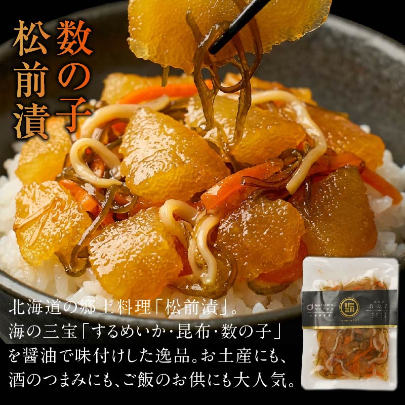 | 商品説明 | 北海道の郷土料理「松前漬」。 海の三宝「するめいか・昆布・数の子」を醤油で味付けした逸品。お土産にも、酒のつまみにも、ご飯のお供にも大人気。 |