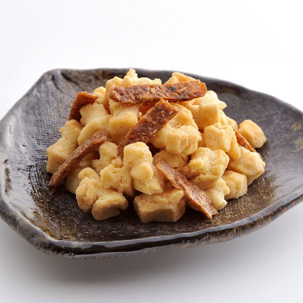 餅米(国産)、植物油脂、米油、甘えび、エビ調味パウダー、食塩、鮭、米醗酵調味料、醗酵調味料/調味料(アミノ酸等)、ソルビトール、香料、加工デンプン、トレハロース、焼成Ca、増粘多糖類、くん液(一部に小麦・えび・さけ・大豆・りんごを含む)