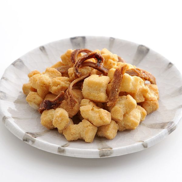 餅米(国産)、植物油脂、米油、いか、イカ調味パウダー、食塩、砂糖、醤油、醸造酢/調味料(アミノ酸等)、香料、ソルビトール、二酸化ケイ素、加工デンプン、酸味料、甘味料(ステビア、カンゾウ)、カラメル色素、(原材料の一部に小麦・卵・いか・ごま・ゼラチン・大豆を含む)