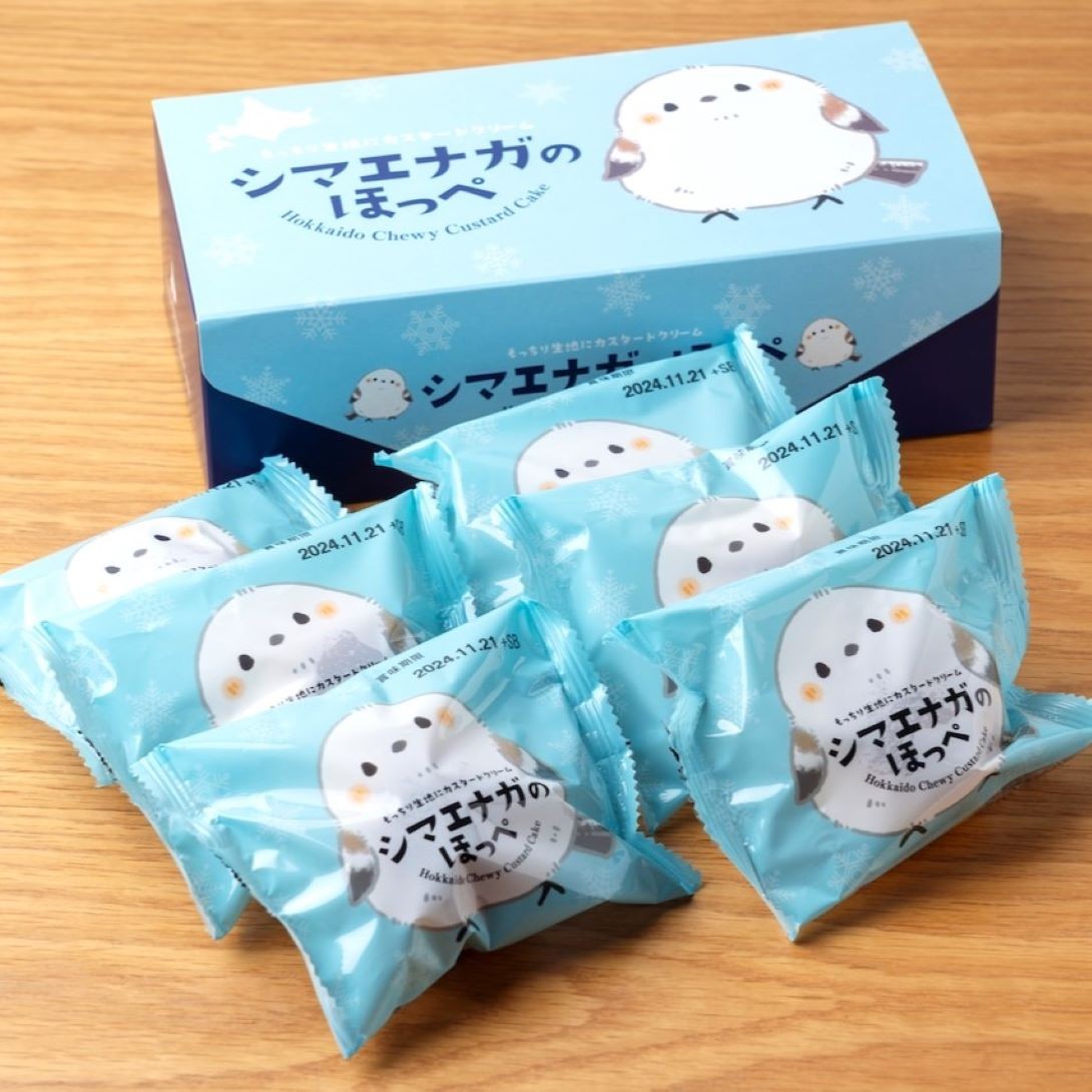 こどものほっぺの様なもちもちの生地で特製カスタードクリームを包みました。雪の妖精シマエナガをデザインしたかわいいパッケージのスイーツです。