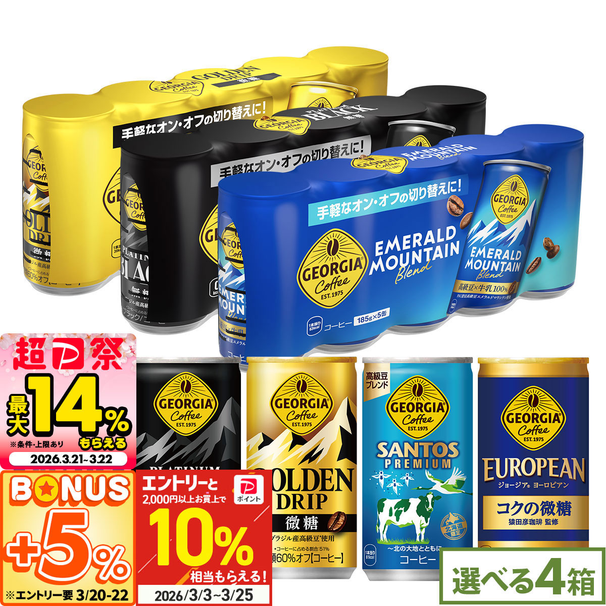 発売以来、みなさまから愛されている「GEORGIA(ジョージア)」ブランド。このたびジョージアファンのみなさまに、お得なセットをご用意致しました。お好きなジョージアを4種類選んで購入していただくと、全国配送料無料となります。この機会に、人気のジョージアコーヒーをお得にまとめ買いしてみませんか?