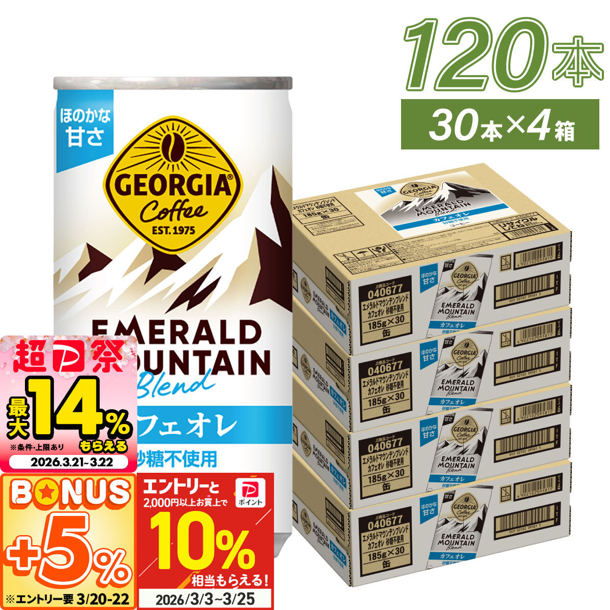 コーヒー 缶 ジョージア エメラルドマウンテン カフェオレ 砂糖不使用 185g 30本入 4箱 120本 送料無料