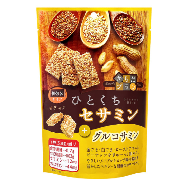 原材料:ごま(国内製造[金ごま、白ごま])、砂糖、水飴、落花生、ローストアマニ、メープルシュガー、食塩/グルコサミン、香料、(一部にえび・落花生・ごまを含む)