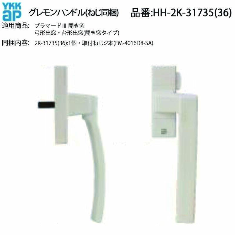 「HH-2K-31735」「YKK AP グレモンハンドル」「弓形出窓 ハンドル」「台形出窓 ハンドル」「プラマード3 開き窓」「左吊元」「右吊元 2K-31736」「CH色 受注生産」「補修 部品」