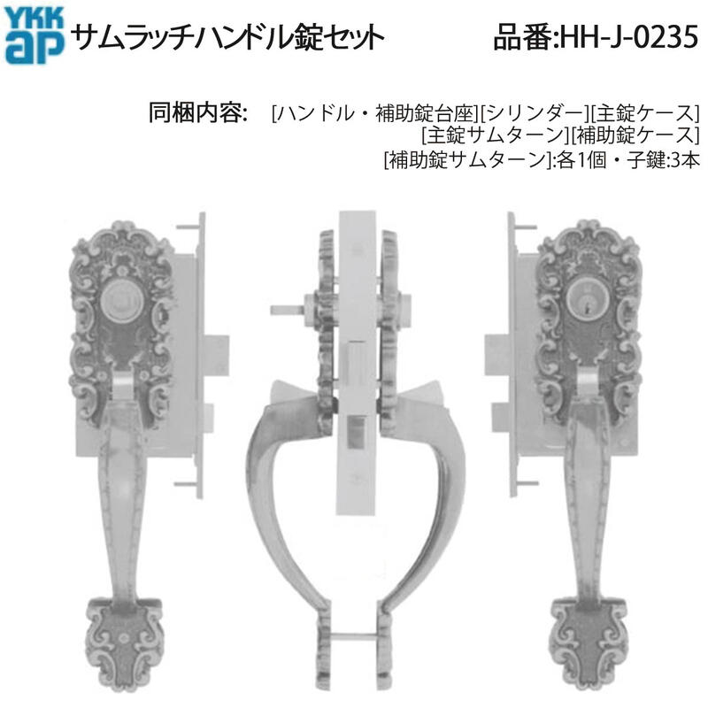 | ■入数 | [ハンドル・補助錠台座][シリンダー][主錠ケース][主錠サムターン][補助錠ケース][補助錠サムターン]:各1個・子鍵:3本 |