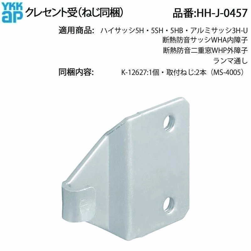 クレセント受(HH-J-0457)は、YKKの引違い窓に対応した錠受け部品です。この製品は、ハイサッシ5Hやアルミサッシ3H-Uなど、さまざまなサッシに適合し、断熱防音性能を持つ窓にも対応しています。取り付けは簡単で、付属のねじを使用することで確実に固定できます。交換用としても最適で、窓の安全性と機能性を向上させるための信頼できる選択肢です。ジャンル:YKK ap 住宅 建材 アルミサッシ 修理 故障 不具合 修繕 交換 DIY 日曜大工 取り替え リフォーム アルミ 純正 部品 補修/部品検索用:hhj0457 適用商品番号 K-12627