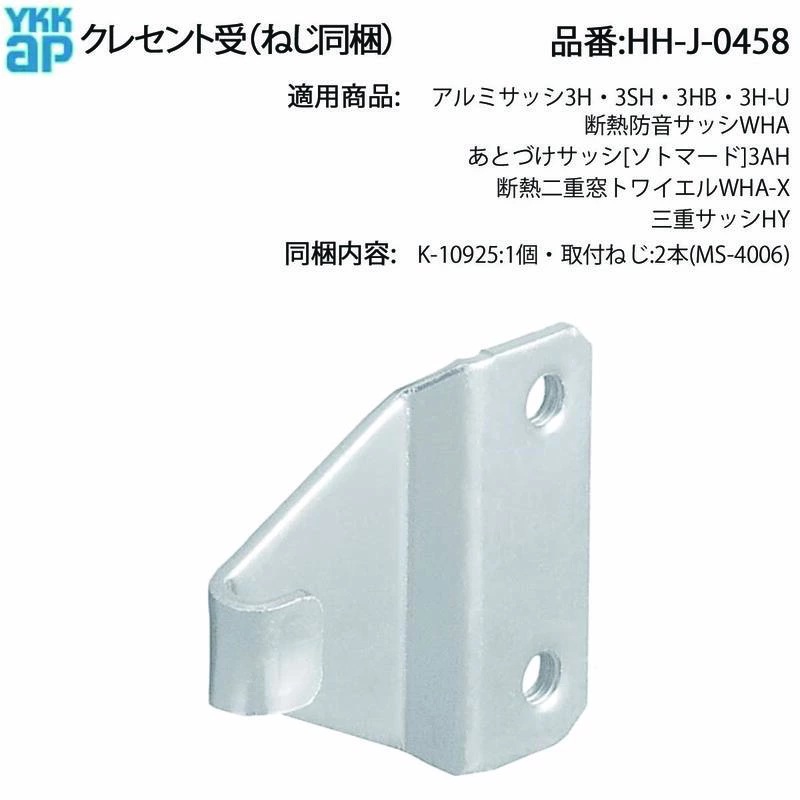 クレセント受(HH-J-0458)は、YKKの引違い窓に対応した錠受けです。アルミサッシや断熱防音サッシなど、さまざまな窓タイプに適合し、簡単に交換が可能です。この製品は、窓の安全性を高めるために設計されており、しっかりとした固定を実現します。取り付けねじも付属しており、取り付け作業がスムーズに行えます。信頼性の高いYKK製品で、安心してご使用いただけます。ジャンル:YKK ap 住宅 建材 アルミサッシ 修理 故障 不具合 修繕 交換 DIY 日曜大工 取り替え リフォーム アルミ 純正 部品 補修/部品検索用:hhj0458 適用商品番号 K-10925