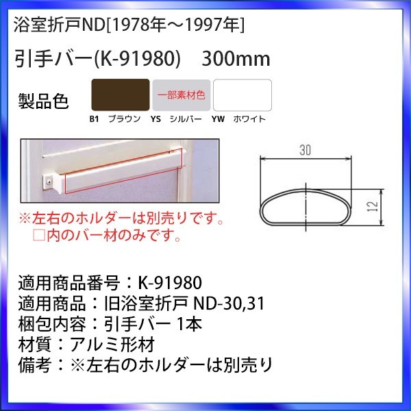 YKK AP 浴室折戸 NDシリーズ他対応 引手バー K-91980 長さ300mm 切断対応 純正交換用引手金具 サニセーフ折戸など古い浴室ドアにも対応する交換用引手バー