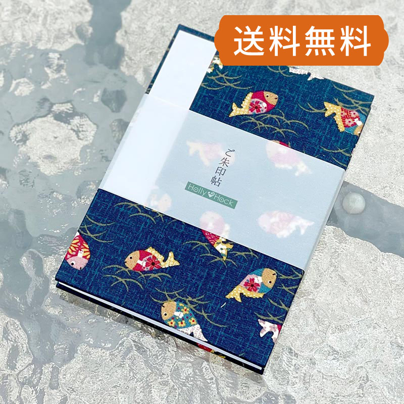 御朱印帳とは、神社や寺院でご朱印を頂く帳面です。総柄の生地をカットして表紙を製作しておりますので製品によって柄の出方が違います。画像や説明文に掲載されております絵柄が含まれていない場合もございますので予めご了承ください。表紙は紺地にカラフルな鯛がプリントされています。鯛に花柄を組み合わせた、和風のテイストでとても可愛らしい雰囲気です。中の紙は神社仏閣で取り扱っているご朱印帳と同質の白色の和紙を使用しております。伊勢神宮や出雲大社など、お伊勢参りや全国の神社・仏閣の参拝時におつかいください。