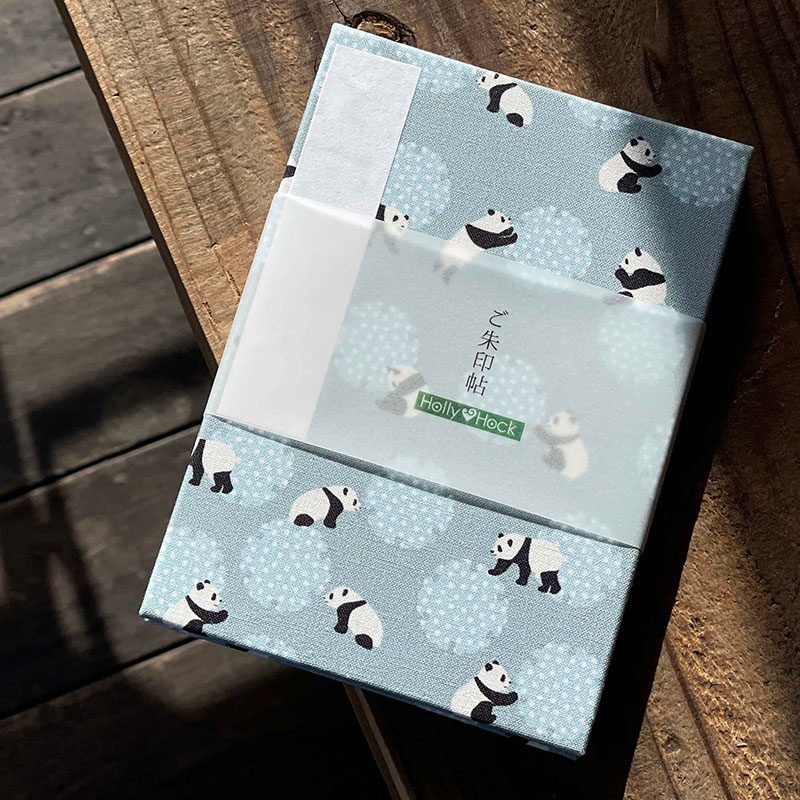 朱印帳(納経帳)は神社や寺院でご朱印を頂く帳面になります。表紙はイラストレーター(Nico design 小林ゆかりさん)の作品でホリーホックオリジナルの御朱印帳です。落ち着いたブルーグレーの背景に雪輪とパンダの模様。雪輪は雪の結晶を文様化したもので、雪片の六角形の輪郭を円形に描いたものです。冬にはもちろん、涼しさを求めて夏にも使われる柄です。御朱印帳の紙は日本の多くの神社仏閣のご朱印帳で使用されております白色の和紙です。伝統技術を持つ職人が1冊1冊、手作りで蛇腹の御朱印帳を製本しております。