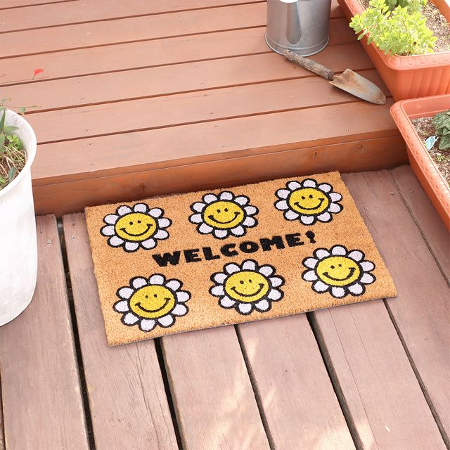 人気のスマイル柄が、玄関で明るくお客様をお出迎えします♪水はけの良いココナッツの繊維を使用。びっしり敷き詰められた繊維が、靴の汚れを落としてくれるので玄関やベランダにおすすめ。裏面はPVC素材を使用しているので滑りにくく、お手入れも簡単です。サイズ:約 縦40cm×横60cm素材:ココナッツ繊維100%裏面:ラバー加工ココナッツの固い素材ですので、インテリアマットとは異なります。屋外用 玄関マット