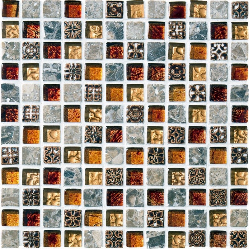 宝石をミックスして敷き並べたパヴェジュエルのようなモザイク。大理石やガラス、磁器などの多素材が混ざり合った美しいタイルです。